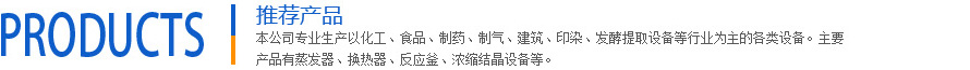 本公司專(zhuān)業(yè)生產(chǎn)以化工、食品、制藥、制氣、建筑、印染等行業(yè)為主的各類(lèi)設(shè)備。主要產(chǎn)品有發(fā)酵提取設(shè)備,濃縮結(jié)晶設(shè)備,蒸發(fā)器、換熱器、反應(yīng)釜、分離容器、儲(chǔ)罐、熱交換器、冷凝器,全自動(dòng)供水設(shè)備、不銹鋼裝配式水箱、凝結(jié)水回收等各類(lèi)壓力容器及非標(biāo)產(chǎn)品。其中離心式刮板薄膜蒸發(fā)器獲江蘇省優(yōu)質(zhì)產(chǎn)品。